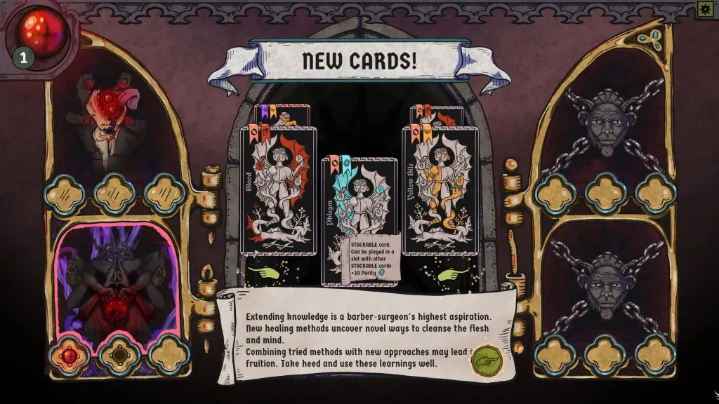 Окей, я только что поиграл в игру под названием BLOODLETTER, и она действительно отличается. Представьте, что кто-то нашёл очень старую, жуткую средневековую книгу об ужасных медицинских практиках и решил сделать из неё карточную игру. Она неторопливая и немного тревожная, что мне очень понравилось. Но вот в чём дело — вы не играете за благородного рыцаря или героя. Это совершенно другая атмосфера.