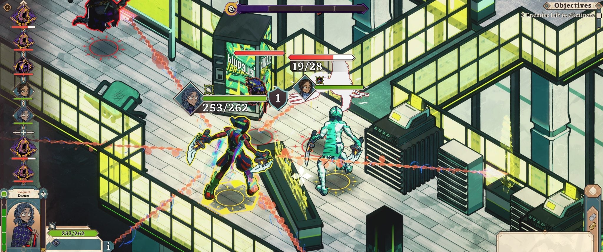 Бои происходят на небольшой сетке, где вы используете карты способностей, чтобы направлять свою команду и побеждать врагов.
